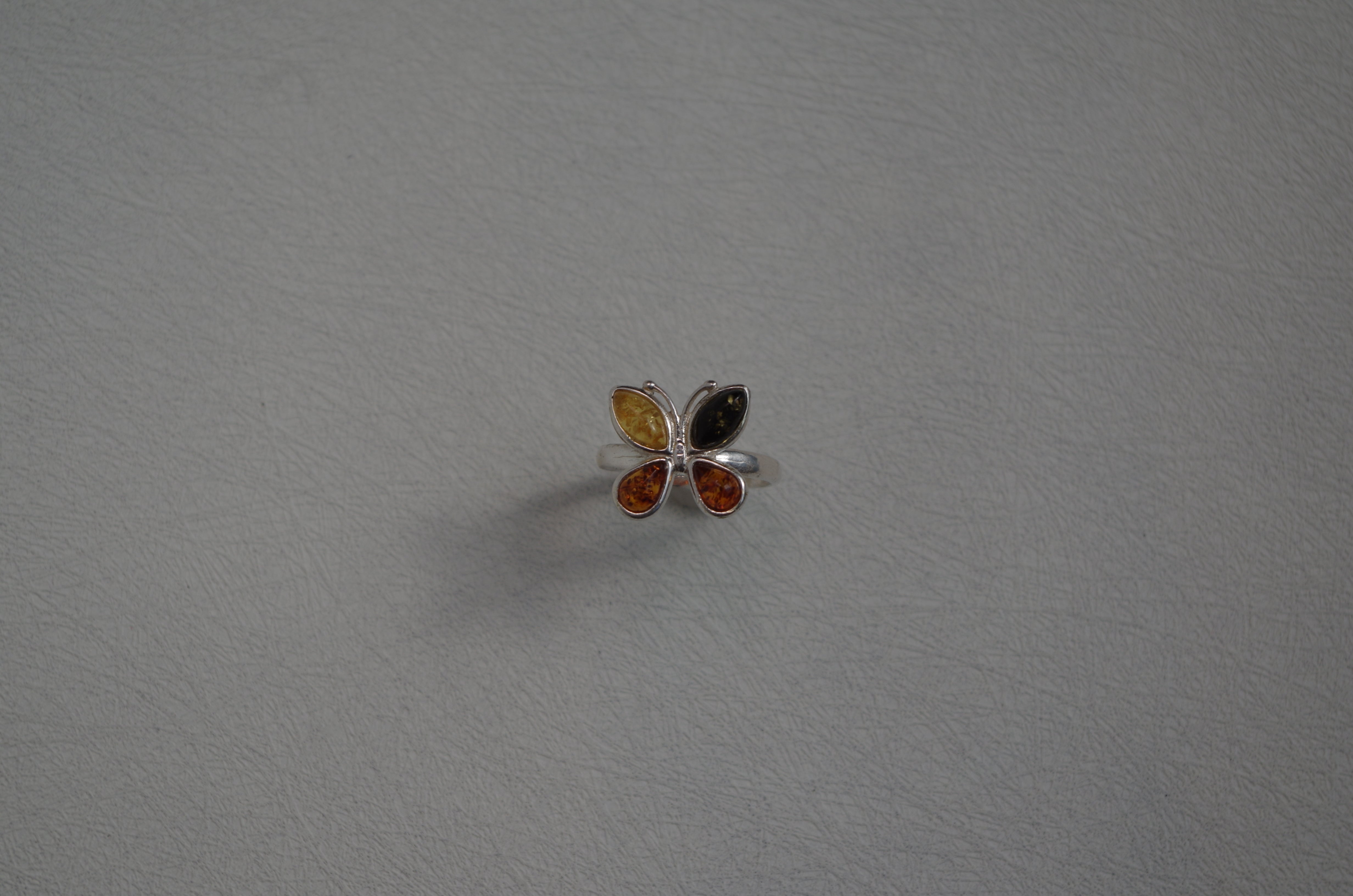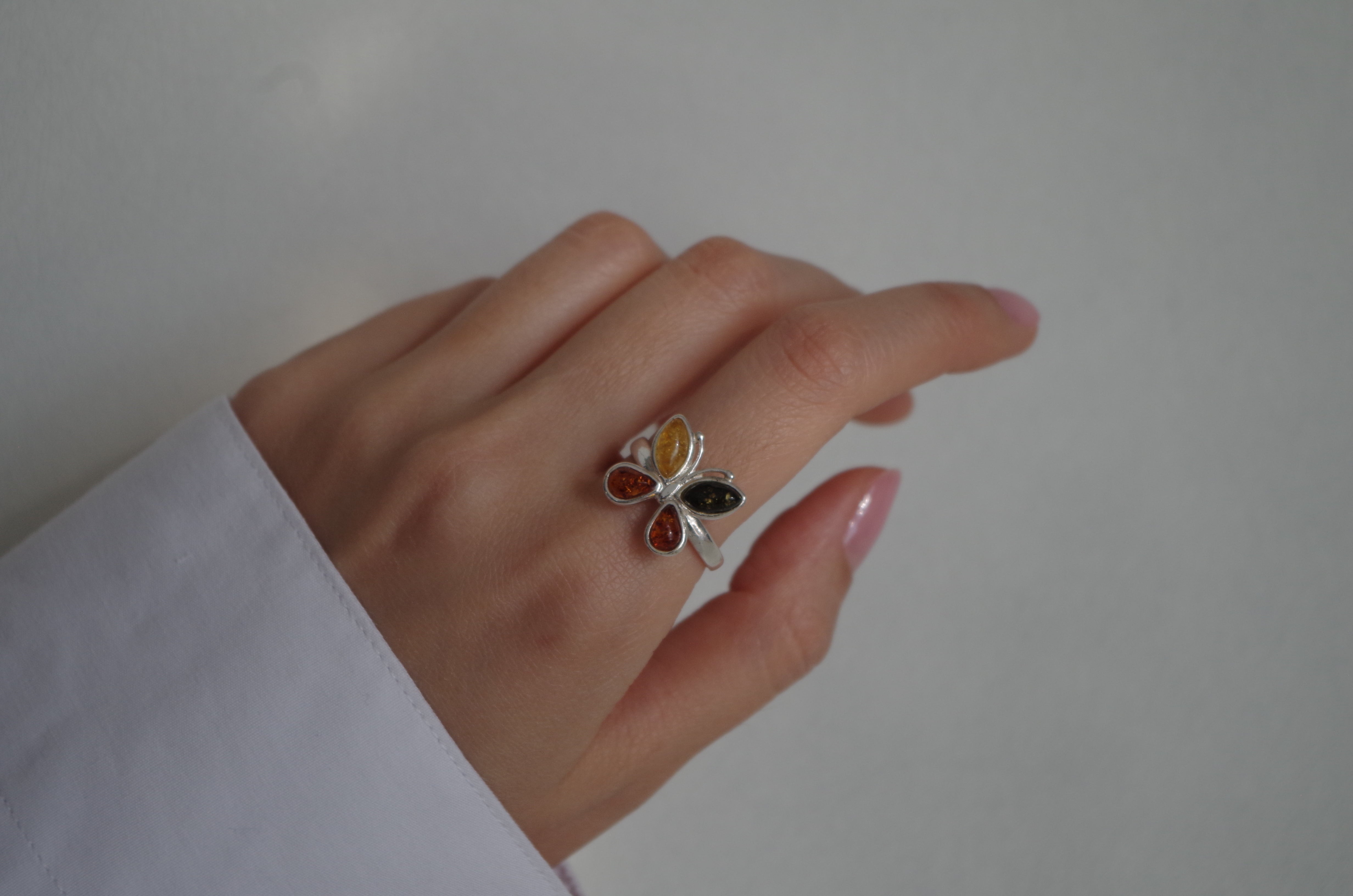 • multi-colored variants of Baltic Amber laid out in a butterfly setting on a handcrafted 925 Sterling Silver ring. Amber is known to be a protection stone!
