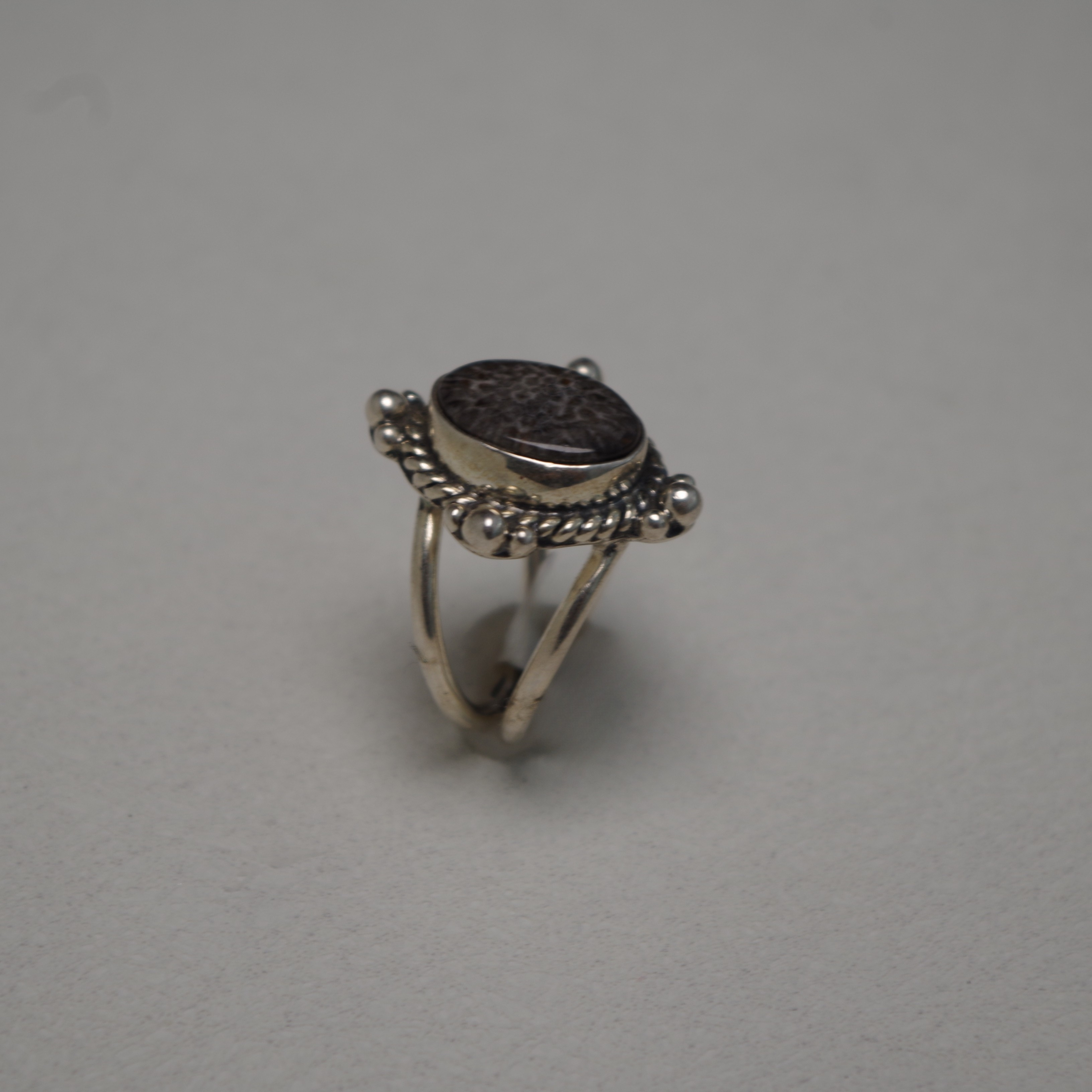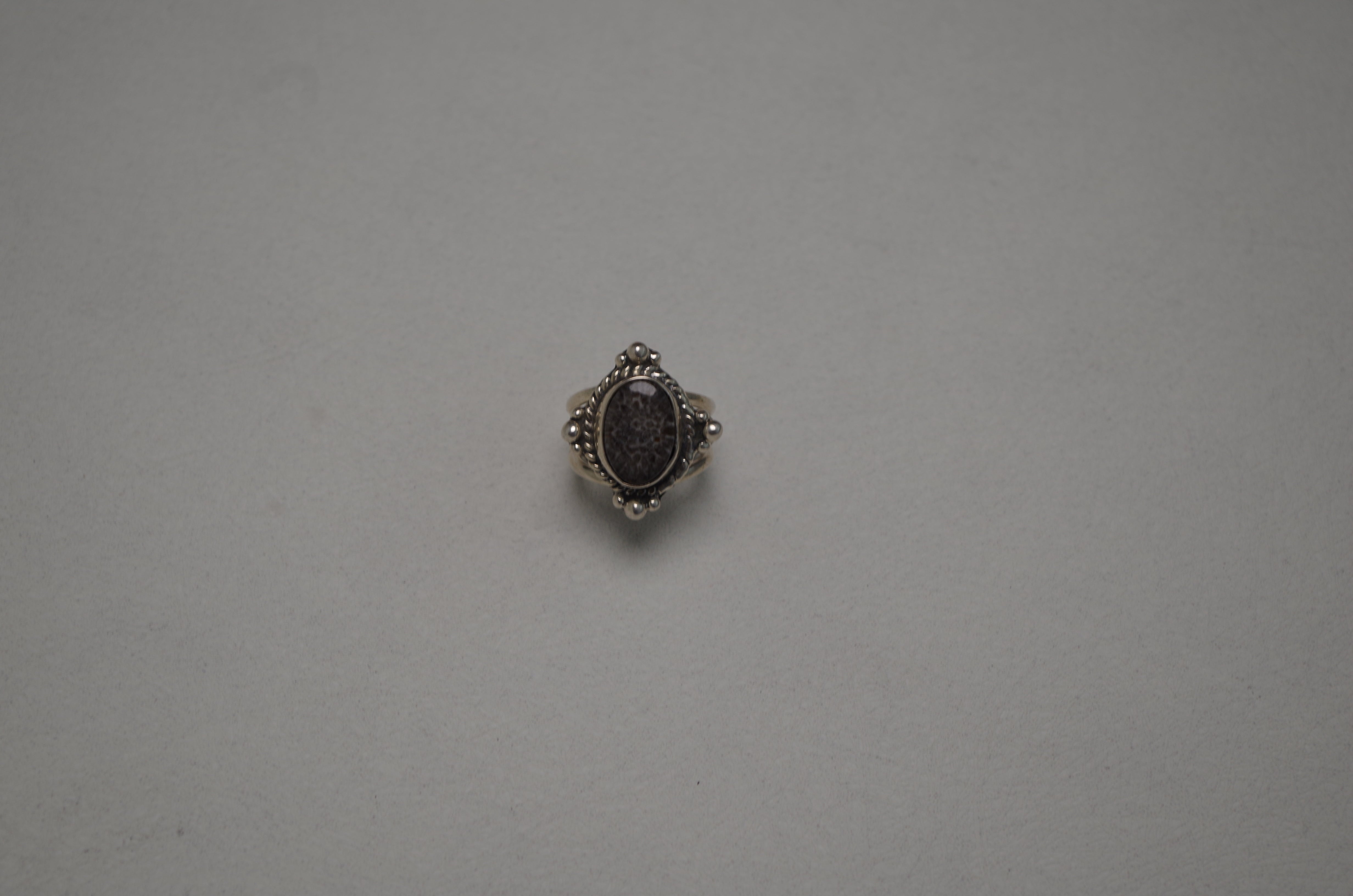 - stingray coral, named for its resemblance to stingray skin. it's known to be used for emotional healing. the stingray coral is surrounded with rope detailing and the ornate dots, giving it a vintage feel, set on a double band.