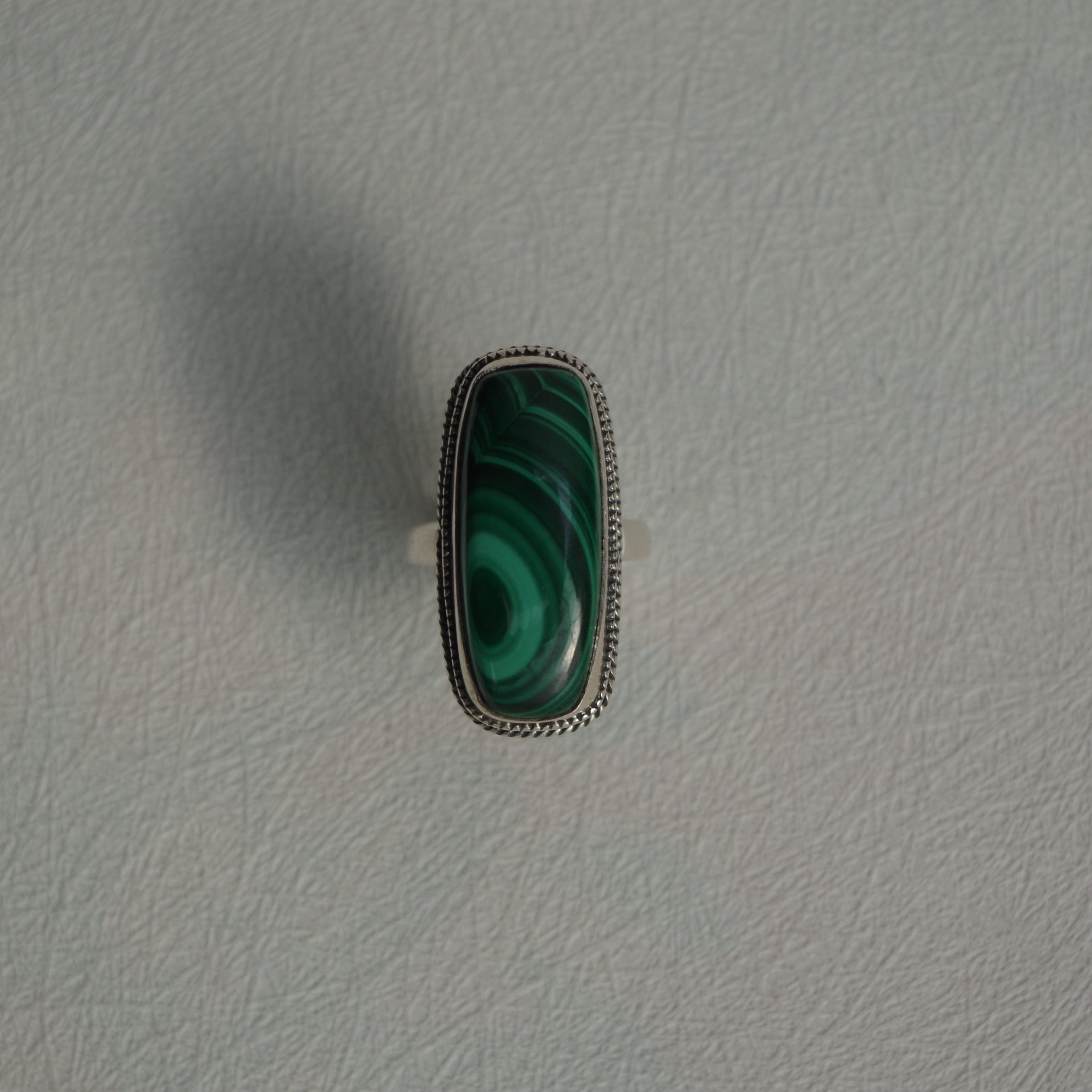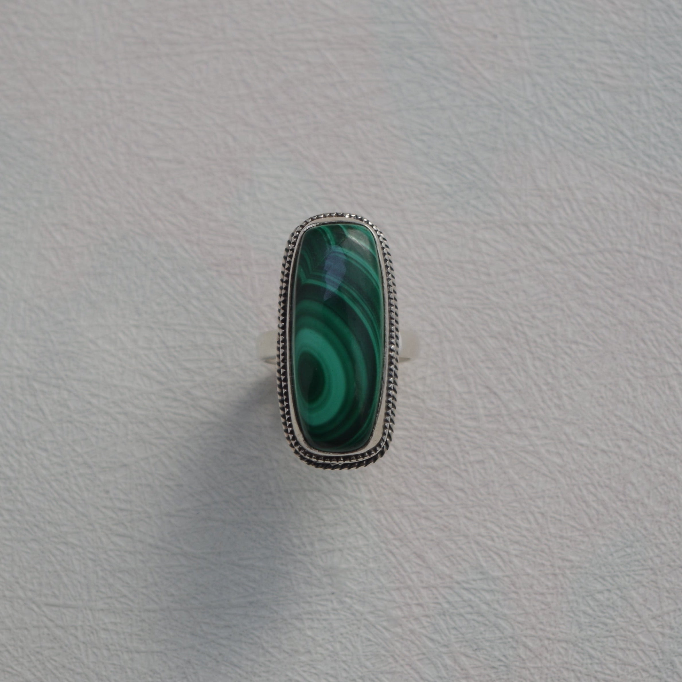 - beautiful hypnotic swirls in the Malachite stone with rope detail surrounding the stone set on 925 Sterling Silver band.