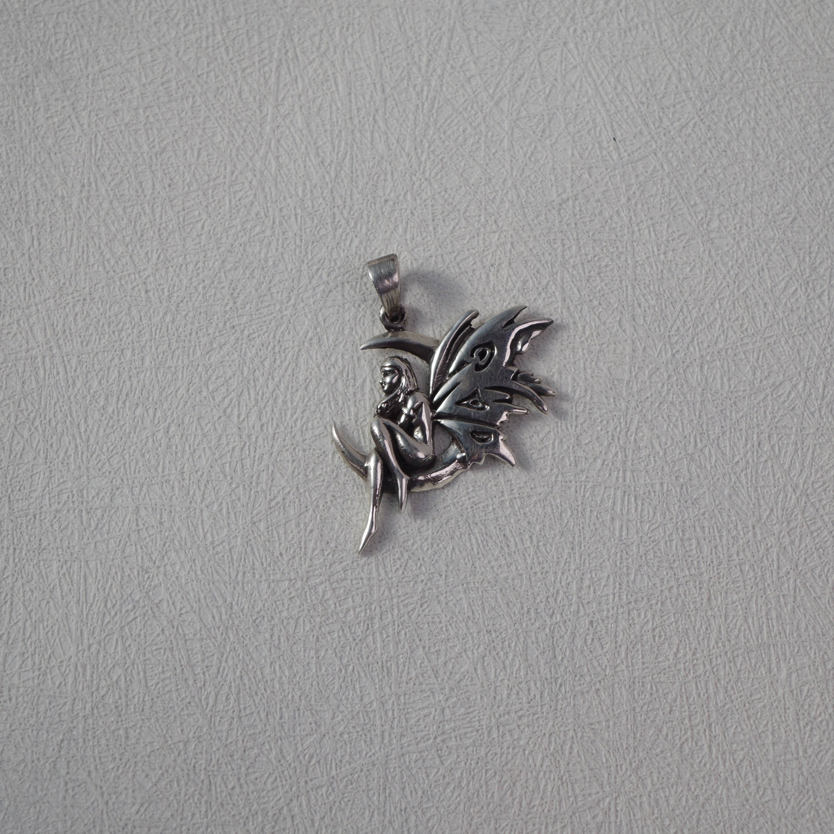 • fairies have always held so much awe and wonder for us. this fairy pendant depicts her pondering while sitting on a crescent moon. she'd be perfect on a shorter chain/choker layered!