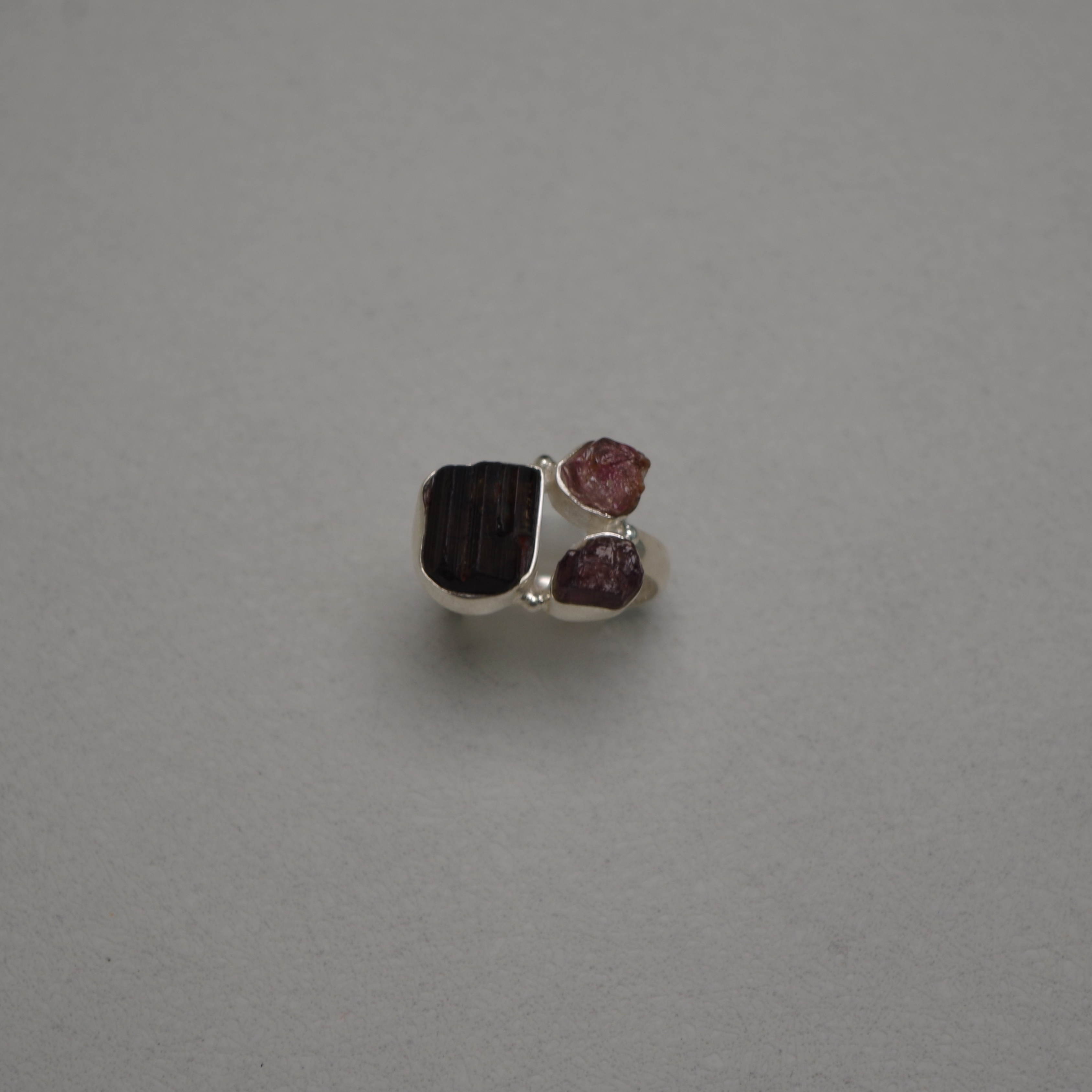 • a trio of raw finish black, pink and purple tourmaline stones, set in 925 Sterling Silver.